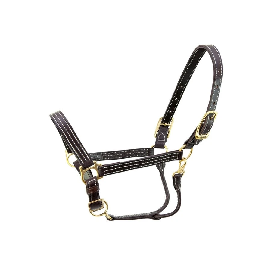 This horse halter mirrors the #1 selling British Halter but offers an adjustable chin. 1″ wide and white triple stitched it has a timeless look.